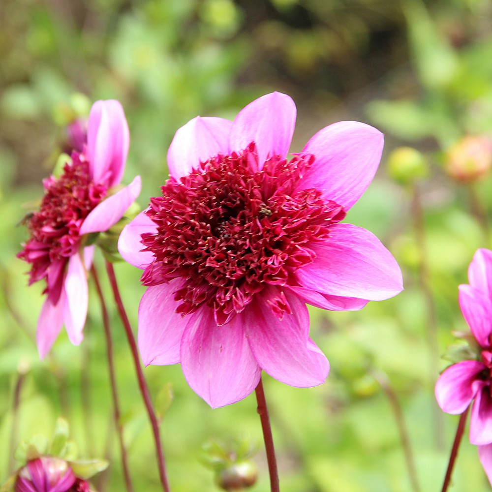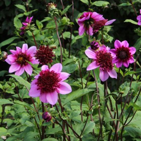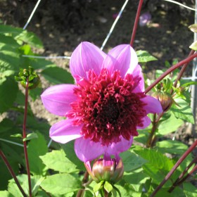 Wunderschöne, lila-rosa Anemone-blühende Dahlie. Ein blauer Schimmer liegt über der Blüte, Blütengröße 10-15 cm.