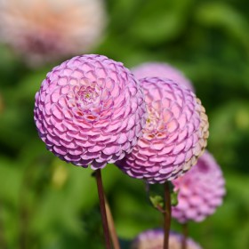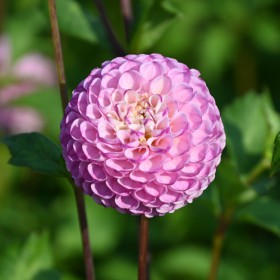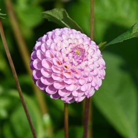 Pompondahlia mit lila-rosa, kleinen, runden Blüten. Die Innenseite der Blütenblätter ist leicht weiß. Blütengröße 5 cm.