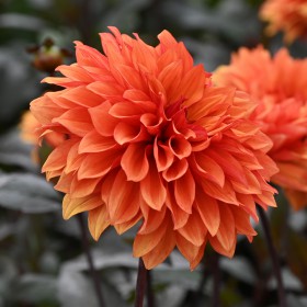 Dekorative Dahlie. Die orangefarbenen Blüten bilden einen schönen Kontrast zum dunklen Laub. Blütengröße 12 cm.