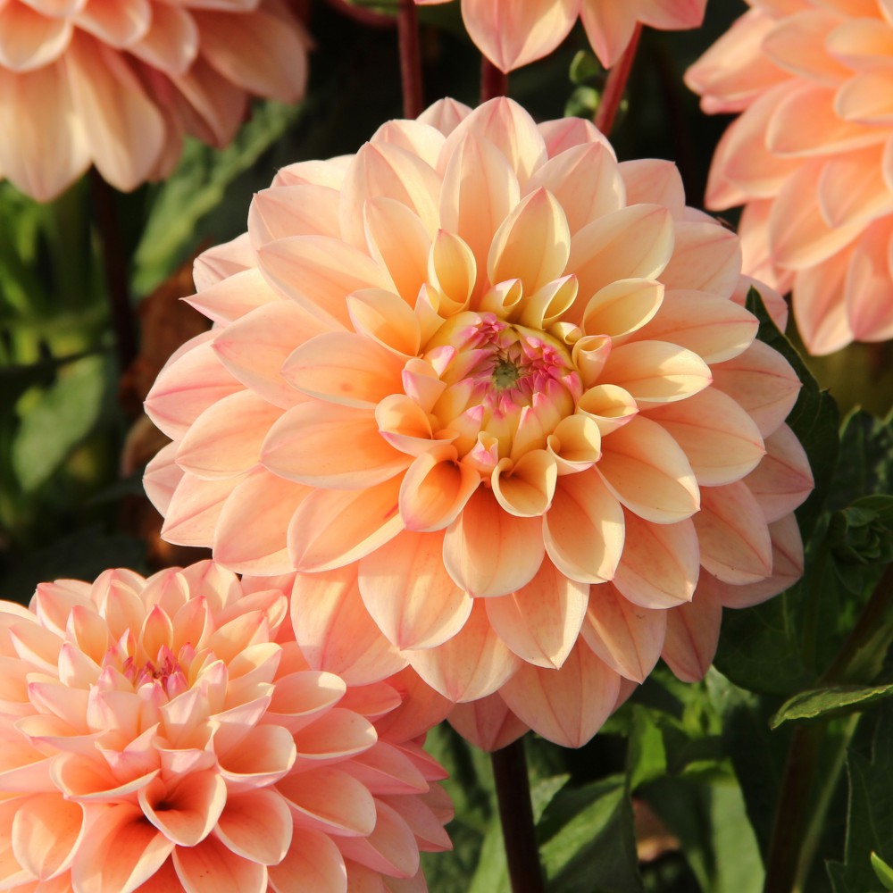 Dekorative Dahlie, nicht allzu hoch, zartrosa Blüten, goldgelb im Herzen, an den Spitzen der Blütenblätter etwas dunkler rosa. Blütengröße 10 cm.