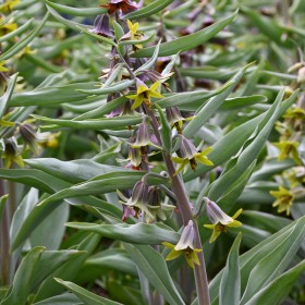 Eine asiatische Art mit kleinen, pagodenförmigen Blüten. Hervorragende Auslese, bei der die Außenseite der Blüte eine violette Färbung aufweist, die Innenseite ist lindgrün mit einem dunklen Auge. Die elliptischen Blätter sind grau-grün und sitzen um einem 25-30 cm hohen Blütenstiel.