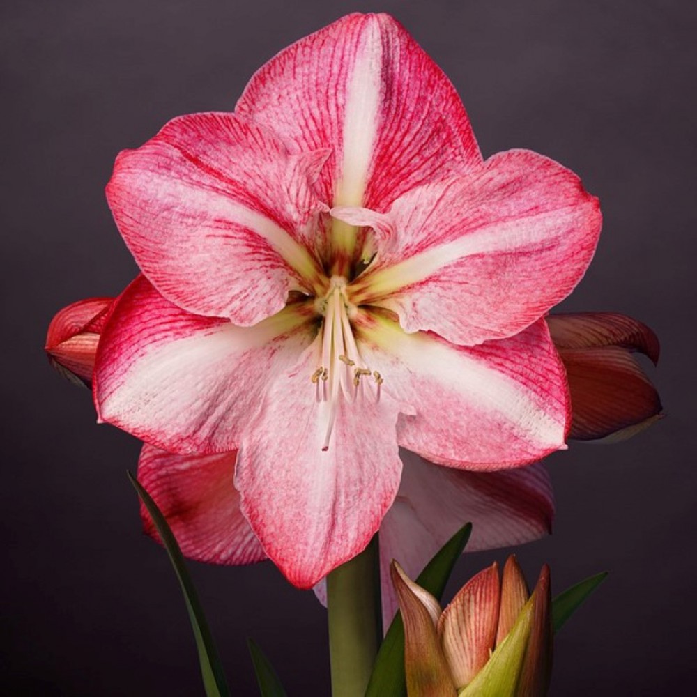 Rosa mit weiß, Blütengröße 22 cm. Galaxy Group. Pflanzen Sie die Blumenzwiebel ungefähr bis zur Hälfte in der Blumenerde. Nehmen Sie einen Blumentopf in wo die Blumenzwiebel gut hineinpasen mit einer Öffnung für den Wasserablauf. Eine normale Zimmertemperatur von 20°C ist erforderlich für die Enwicklung des Blumenstieln. Geben Sie der Zwiebel wenig wasser bis der Blumenstiel zum vorschein kommt. Die Amaryllis benötigt täglich mehr wasser sobald die Knospe und das Blatt erscheinen. Im Winter dauert es nach dem eintopfen ungefähr sechs bis zehn Wochen, bevor die Zwiebel zur Blüte gelangt.