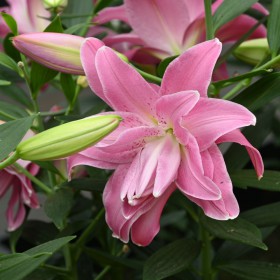 Aus der 'Lotus Lilies' Serie ist dies eine dunkelrosa gefüllte orientalische Lilie. Hellfarben an den Rändern der Blütenblätter.
