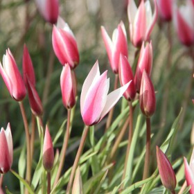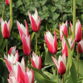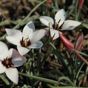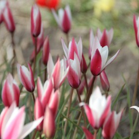 Sehr ähnlich zu T. clusiana. Ceriserode Blumen mit einem weißen Rand. Ein großes violett-lila Herz.