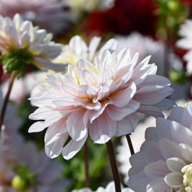Decorative dahlia waterlily-type, soft pink flowers with a cream-coloured heart. Flower size 11 cm.