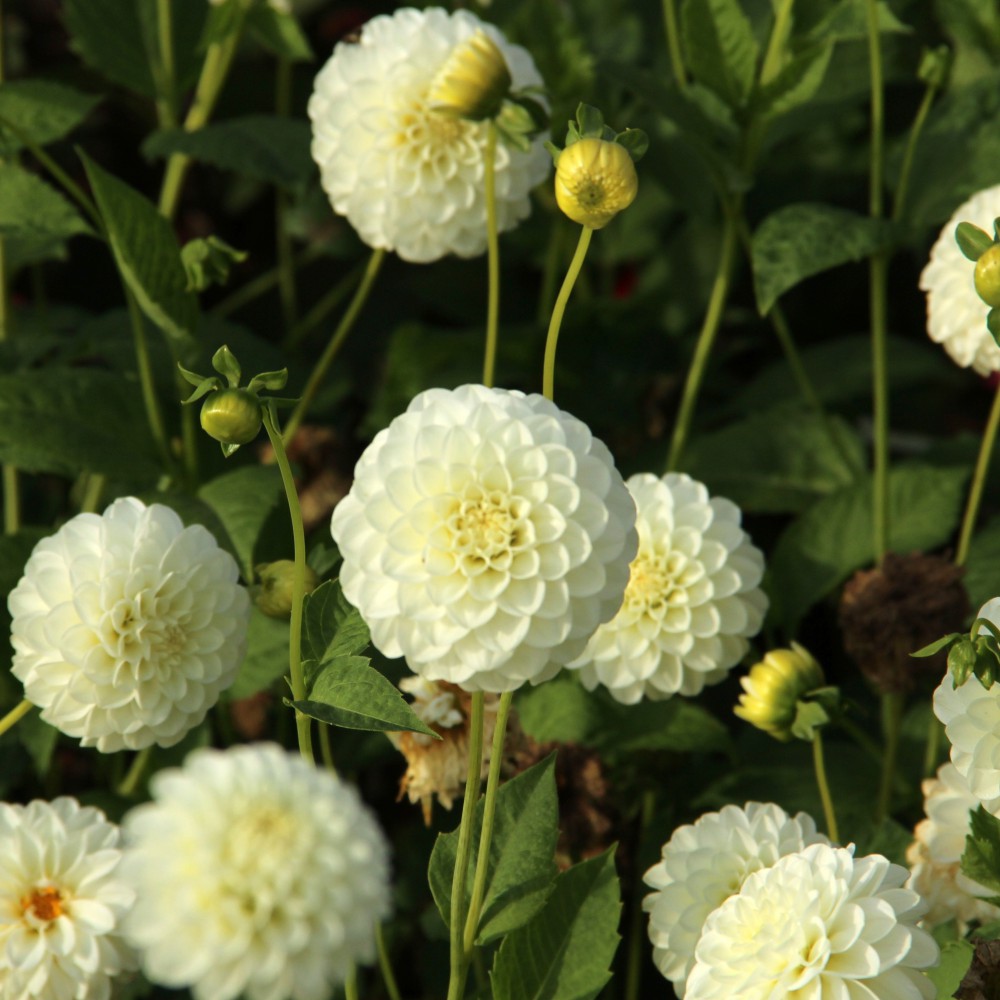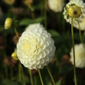 Pompondahlia with pure white, small, round flowers. Firm flower stems. Flower size 6 cm.