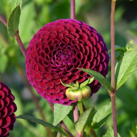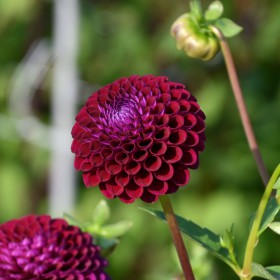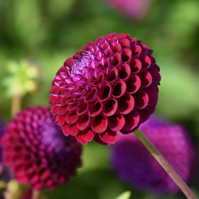 Pompon dahlia with small, purple, spherical flowers. Flower size: 7 cm.