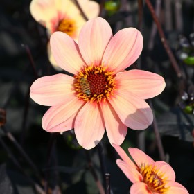 A Beautiful single flowering, dark leaved dahlia. The flowers are salmon-orange with red around the centre, 10 cm. across, height 100 cm. Suitable for containers and border.