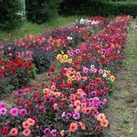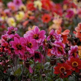 Cheerful mix of single-flowered dahlias, many with dark foliage.