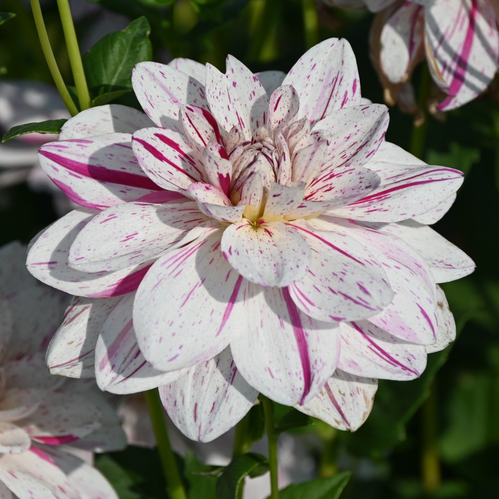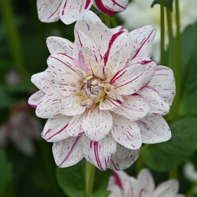 Decorative, white flower with irregular broad and narrow red stripes. Flower size 14 cm.