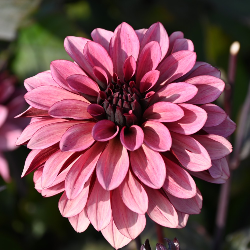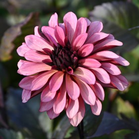 Decorative Dahlia. The pink flowers, the petals of which are shaded with light stripes, turn to soft pink. Beautiful in combination with the dark foliage.
