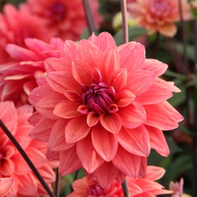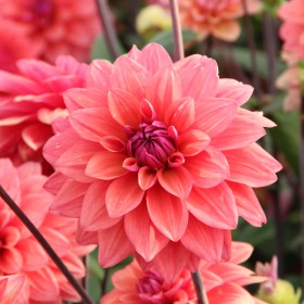 Decorative dahlia, coral pink flowers with a purple center, flower size 15 cm.