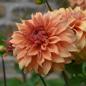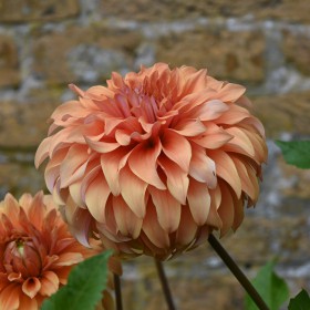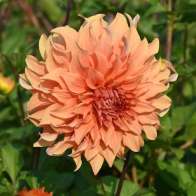 Decorative Dahlia. Large, soft orange flowers. Flower size 20 cm.