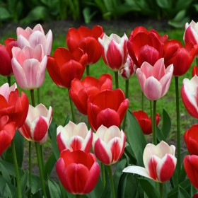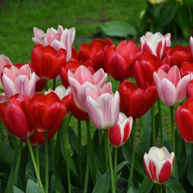 This flamboyant tulip mixture contains four varieties that create a vibrant mix of colours ranging from soft pink to magenta red with lighter highlights.