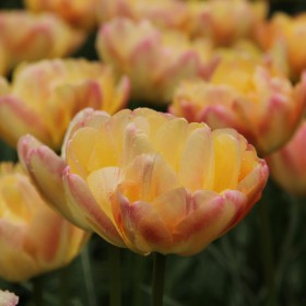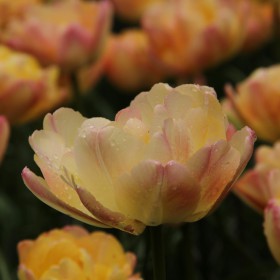Double late tulip, soft beige yellow with light pink on the outside of the flower.