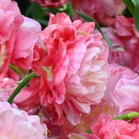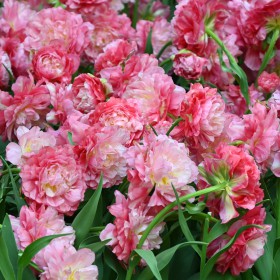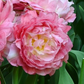 A double late tulip with pretty, peony-shaped, sweet-pink flowers.