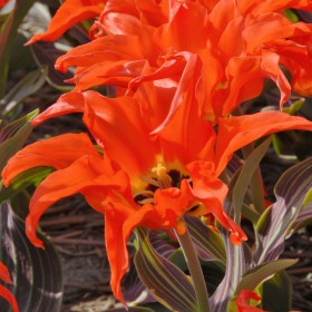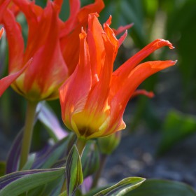 Fosteriana tulip. The orange-red flowers resemble a lily-flowered tulip, the leaves are a striking purple-green.