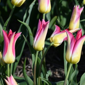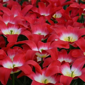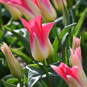 Very large lily-flowered tulip, pinkish red with soft yellow flower.