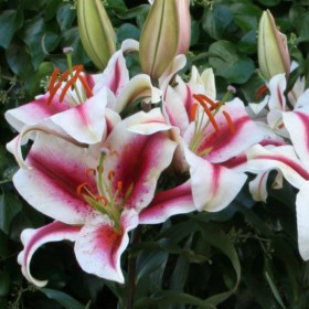 Bicoloured Oriental with large, fragrant flowers. The centre of the white petals have a dark red stripe that widens towards the center.
