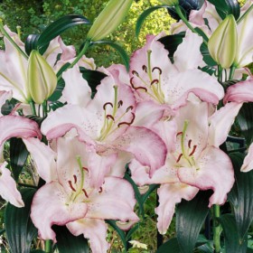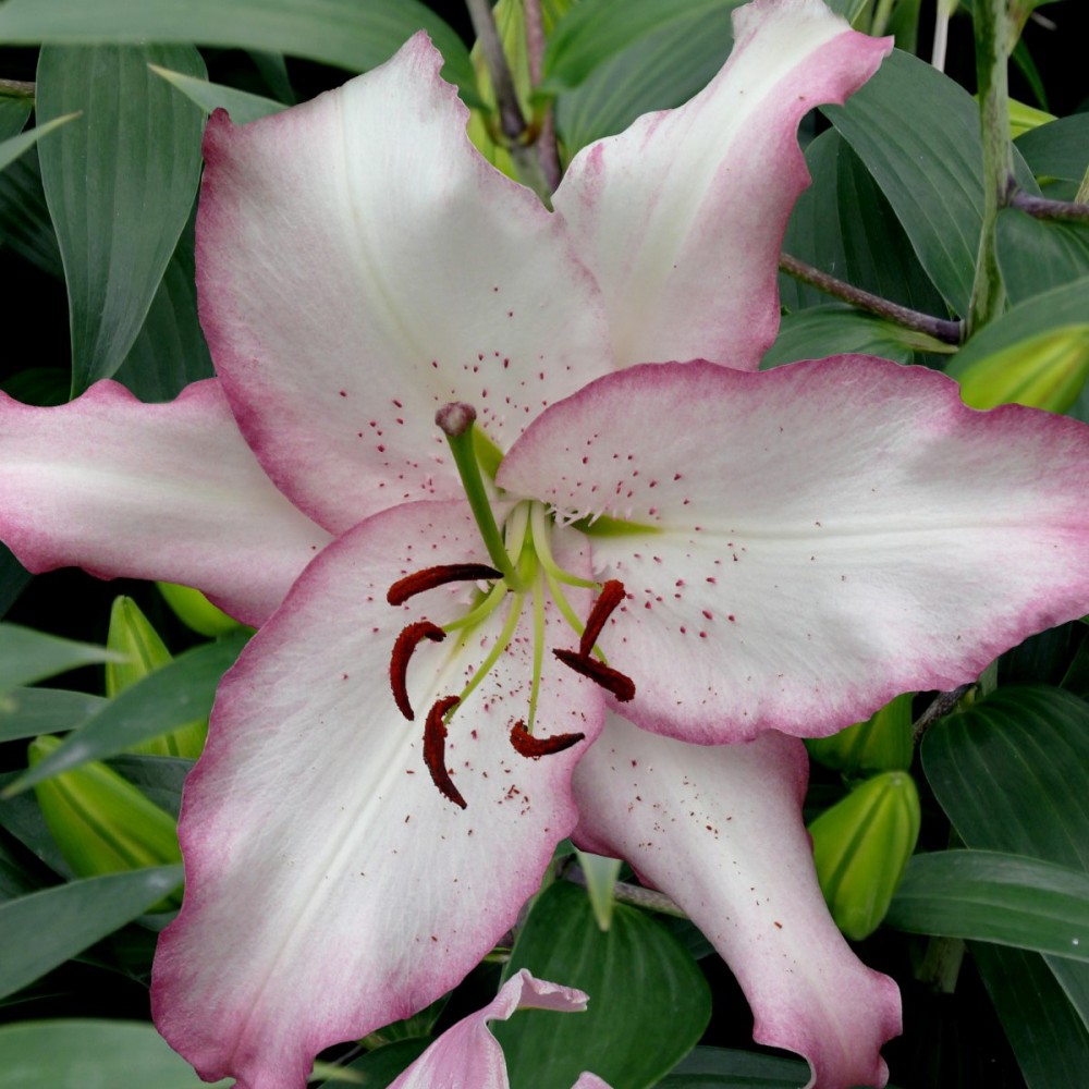 Large, fragrant, white flowers with pink edges along the petals. For the most part outward or slightly downwards facing flowers.