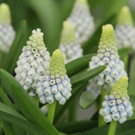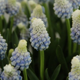 Grape hyacinth with bicoloured flowers. Light blue flowers with a white top.