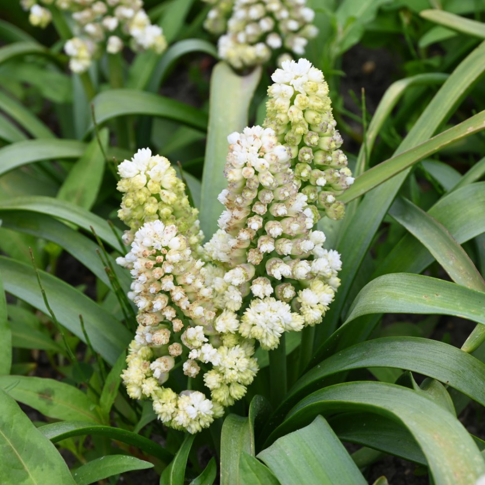 Grape hyacinth with full, pyramidal clusters of double greenish-white flowers.