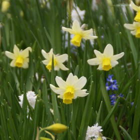 An early flowering, not too tall cyclamineus with white petals and a yellow trumpet. Fine for naturalising.