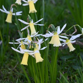 This beautiful cyclamineus has slender creamy-white petals curving backwards, enclosing an initially soft yellow, turning almost white in a later stage, trumpet.