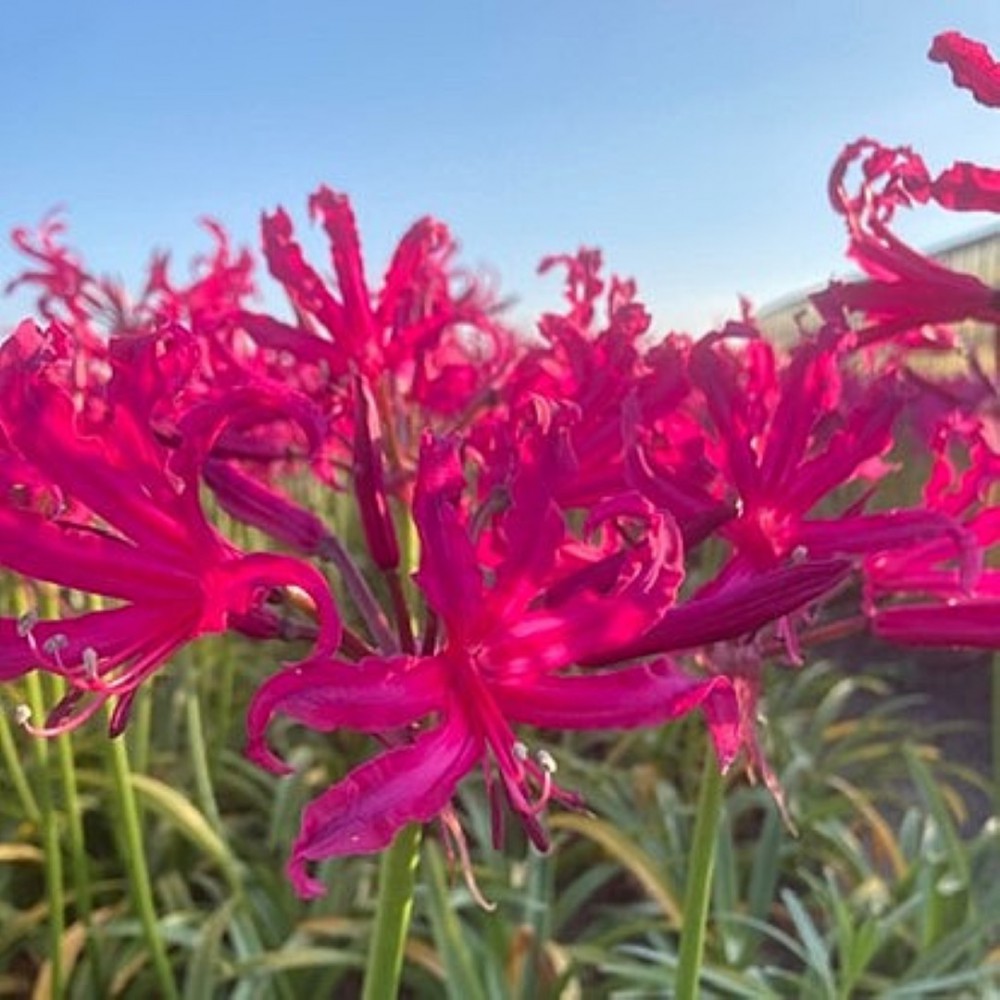 Cornish lily, Cape flower, Guernsey lily, and Bowden lily, autumn-flowering bulbous plant from South Africa. For a position in full sun. Nerine is reasonably hardy and in a sheltered, warm place (possibly with winter cover) will return for years and show its flowers in autumn. Excellent cut flowers. Recently introduced, large cerise flowers on sturdy flower stems.