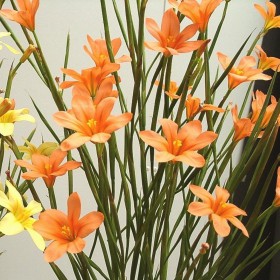 (Syn. Homeria flaccida) Cape tulip. Not related to the tulip but one of the many members of the Iridaceae-family. Cup shaped flowers. Not entire hardy, so give them a good groundcover in winter or dig them out in October. Plant the corms in well drained, humus rich soil in full sun. Hardiness zone 9-10. (aurantiaca), salmon-orange flowers.