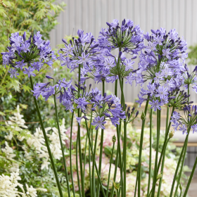 African lily, a richly flowering variety with striped flowers, violet blue with white, long flowering period. Fast growing and evergreen. Fairly hardy in a sunny, warm location with winter protection. Otherwise also suitable for use as a container plant.