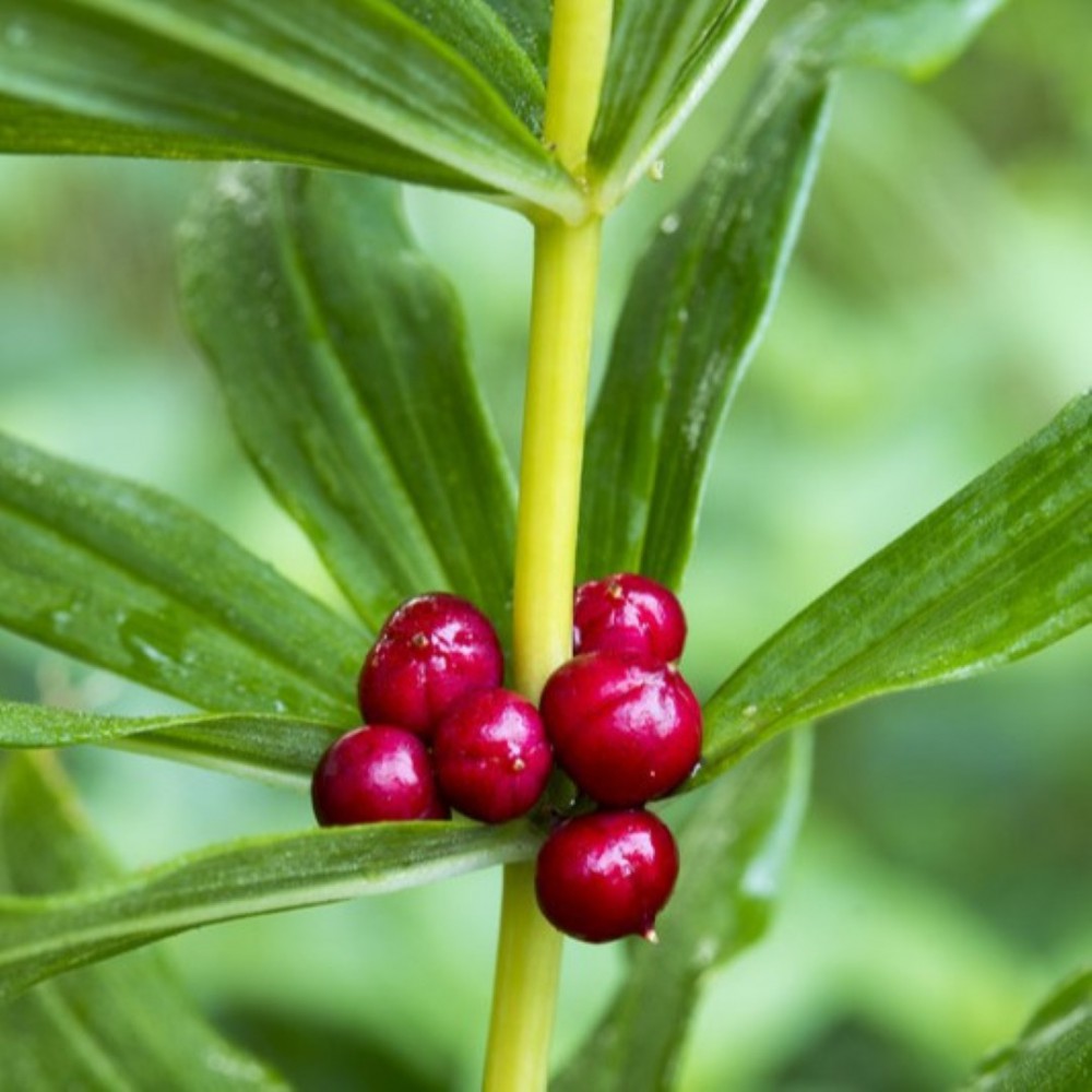 Solomon's Seal. The linear leaves grow in whorls of three to eight pieces together. The green-white, bell-shaped flowers form clusters.