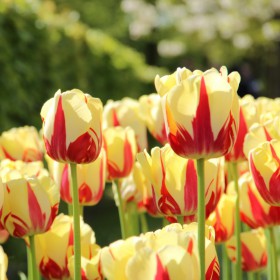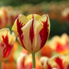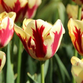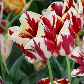 Triumph tulip, the flower drawing is reminiscent of a historic Rembrandt tulip, cream white with red flames.
