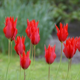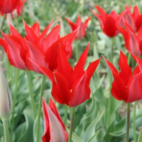 Bright red flowers, lily-flowered, with a capricious, yet elegant growth habit. T. eichleri x T. acuminata.