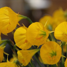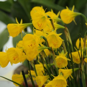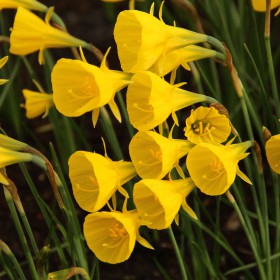 Hoepelroknarcisje, een grootbloemige selectie die veel beter en rijker bloeit dan de soort en waarbij er meerdere bloemstelen (tot wel 7) per bol verschijnen.