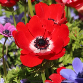 Enkelbloemige anemoon, rood. Vooral bekend als snijbloem, maar ook leuk voor de tuin. Licht afdekken in de winter, hoogte ca. 30 cm. Bloeitijd april-juli.