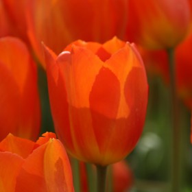 Een statige oranje Darwin-tulp, over de bloemen zit een zweem van lilaroze.