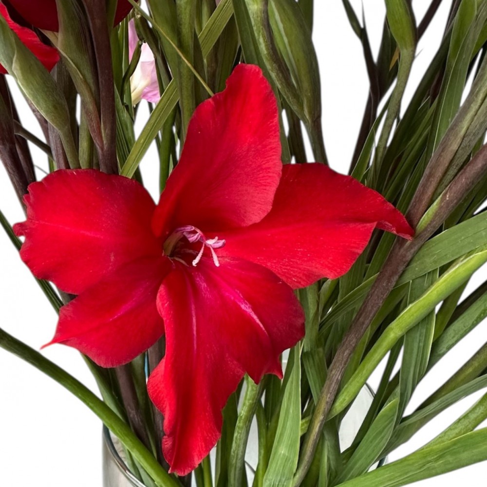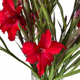Een kleinbloemige gladiool met sierlijke, dieprode bloemen. Op de achterzijde van de bloemen is een zilveren gloed zichtbaar.