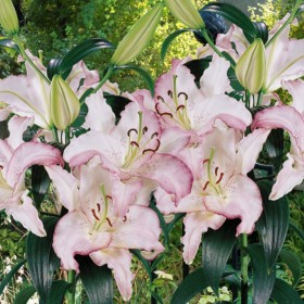 Grote, geurende, witte bloemen met roze randje langs de bloemblaadjes. Voor het merendeel afstaand of iets naar beneden gericht.