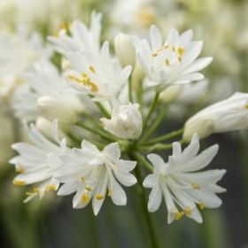 Afrikaanse lelie, een compact groeiende vorm met gevulde, witte bloemen. Redelijk winterhard op een zonnige, warme standplaats met winterdek. Anders ook prima als kuipplant te gebruiken.
